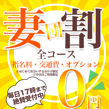 妻 団 割★ づまだん割 ★中央区ご利用限定毎日 9:00〜17:00までにご利用・入室のお客様ははじめてご案内する女の子に限り指名料 0円!交通費 0円!オプション 0円!全てコミコミポッキリ価格でご案内!もちろんオプションは選び放題使い放題! コース時間コ... -